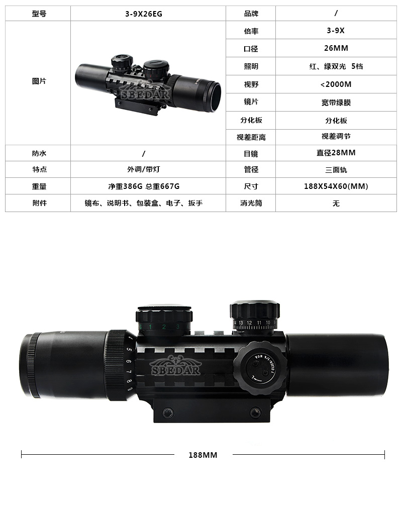 短款高倍3-9x26EG魚骨紅綠光十線瞄準鏡