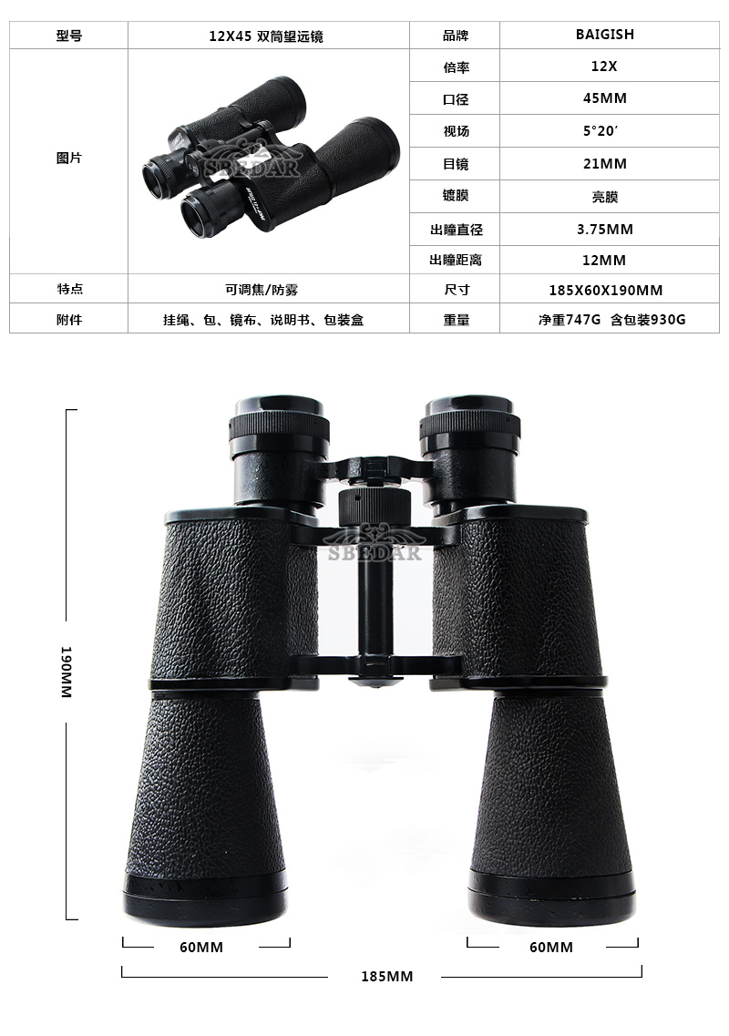 金屬BAISIGH 12X45坐標雙目調焦望遠鏡