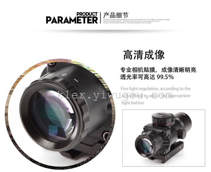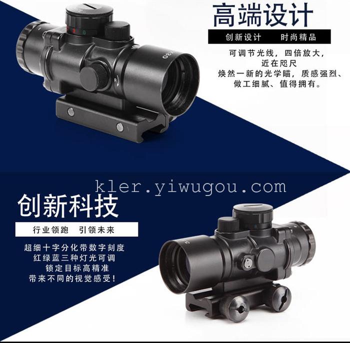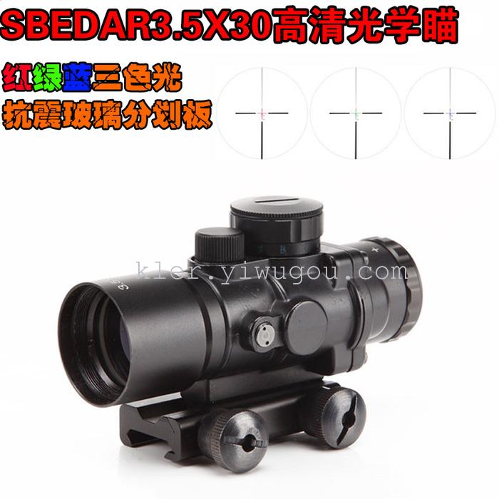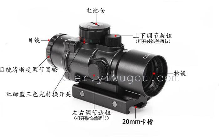 型號:3.5X30瞄準鏡。。。倍數:3.5倍,,長度:13cm。。夾具寬度20mm, 燈光:紅綠藍三色。 分化:抗震分化板。 。。調節:上下左右。。如果夾11m窄燕尾軌道,請拍D11。D12。.D0012。D0026D可以轉換成11mm夾