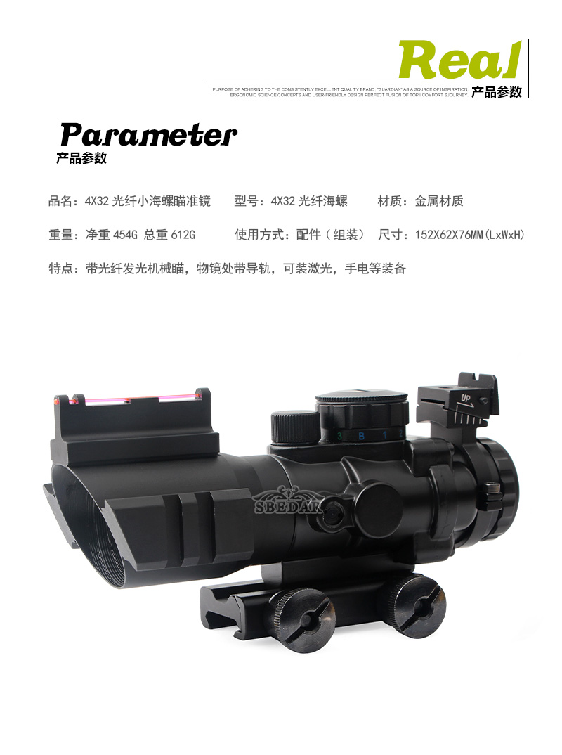 云光小海螺光纖導(dǎo)軌版型號(hào):4X32倍數(shù):4倍物鏡:32mm 長(zhǎng)度:152mm凈重:0.47kg鍍膜:綠膜分化:軍規(guī)玻璃板分化(如圖)燈光:紅綠藍(lán)各三檔