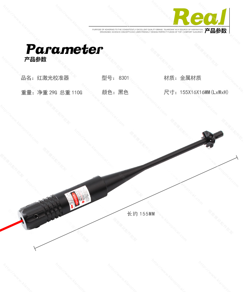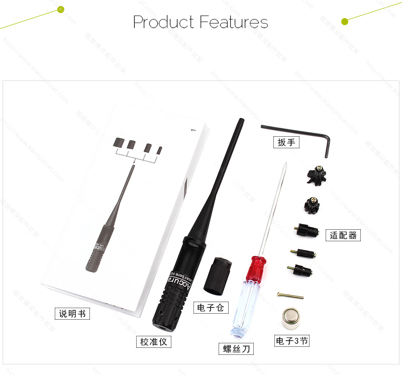 使用簡介:尾部安裝和調節上正確的適配器,然后插入膛中,使之于膛線在一直線。通過瞄準觀測魚雷射光點,使與光點重合即可。同理可以調節紅光和激光瞄準器